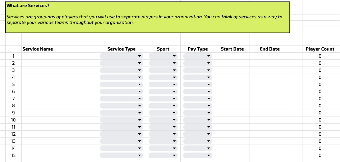 Upon completion of contract and beginning stages of onboarding, each organization will receive a sheet like the one below, to begin populating their services, coaches and players.