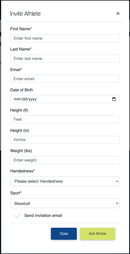 Whenever you are adding athletes to the Pelotero Platform, you will have the option of 'Sending Athlete Invitation' upon completion.